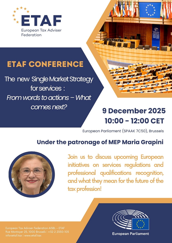 The European Tax Adviser Federation (ETAF), în cooperare cu eurodeputatul Maria Grapini, vă invită să vă alăturați vocilor importante ale Parlamentului European, Comisiei Europene, statelor membre, mediului academic și domeniilor financiar-contabil și fiscal pentru un schimb deschis și prospectiv cu privire la ceea ce urmează pentru piața unică a serviciilor și la modul în care ar trebui să se pregătească profesioniștii din domeniile financiar-contabil și fiscal.